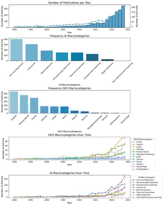 Evolution of the application of AI in geomorphological studies. From top: annual trends in publications (bar chart) and journals (line plot); distribution of main AI and geomorphological (GEO) macro-categories; temporal evolution of GEO and AI macro-categories.