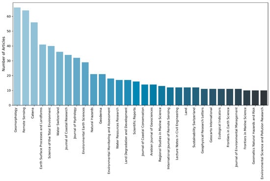 Number of AI-based geomorphological studies published in the top 30 most frequent journals.