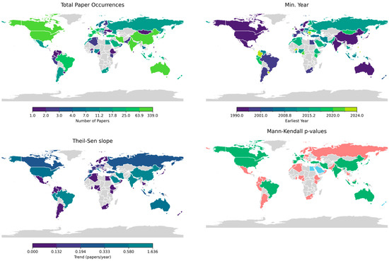 Geographical distribution of scientific publications over time: total number of papers (top left), earliest year of occurrence (top right), Theil–Sen slopes (bottom left), and corresponding p-values (bottom right) of the Mann–Kendall Test. In the p-value map, countries are colored based on the statistical significance of the trend: green for p < 0.05 (statistically significant), blue for 0.05 ≤ p < 0.10 (marginally significant), red for p ≥ 0.10 (not significant), and light gray for countries with missing data.