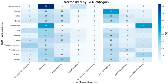 Percentage of use of different AI macro-categories within each geomorphological (GEO) category. Values are normalized by GEO category and show which AI techniques are most commonly used in each field.