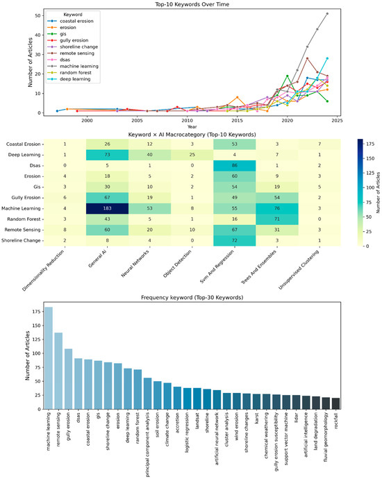 The bar chart at the bottom of Figure 7 provides a broader perspective by displaying the 30 most frequent keywords across the literature. In addition to the prevalence of artificial intelligence, related terms, there is a strong presence of classic geomorphological concepts such as gully erosion, coastal erosion, soil erosion, climate change [125,126], and wind erosion [127,128]. Also noteworthy is the recurrence of methodological keywords such as principal component analysis [129,130], logistic regression [131,132], and cluster analysis [133,134,135], indicating the systematic adoption of statistical and data mining techniques. These methods serve distinct yet complementary purposes: PCA is used to reduce the dimensionality of complex datasets while retaining the most informative components; logistic regression is commonly applied for binary classification tasks; and cluster analysis is employed to group data based on similarity without predefined labels.