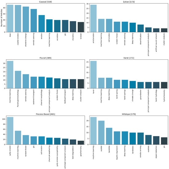 Top 10 most frequent keywords within each of the main six geomorphological macro-categories identified in the literature: Coastal, Eolian, Fluvial, Karst, Process-based, and Hillslope. The numbers in square brackets indicate the total number of papers assigned to each category.
