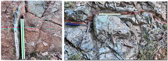 Visual identification: The sampling methodology was primarily focused on ultrabasic geological formations, with particular emphasis on serpentinized rocks-environments in which the presence of naturally occurring asbestos has been previously documented, as illustrated in Figure 1. Visual identification of asbestos fibers was undertaken with care, and particular attention was given to mineralized streaks and zones exhibiting clear evidence of asbestos within these formations, geological ruler presents vein of antigorite and in the right red line presents the vein of lizardites.
