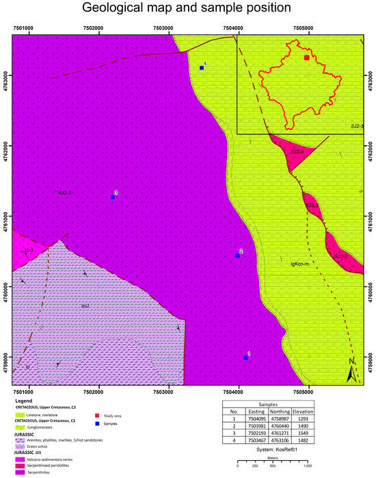 Figure 2 presents the geological map of the study area [30], which is situated in the northern part of Kosovo.