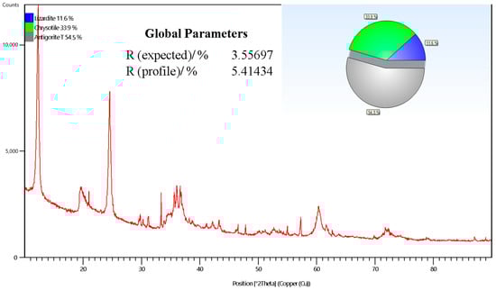 The results revealed variable asbestos content in samples 1, 2, and 3, while no asbestos phases were identified in sample 4. The global refinement parameters Re and Rp were below the commonly accepted threshold (R < 10) and were closely aligned, indicating strong consistency and high reliability between the SEM and XRPD (Rietveld) methods.