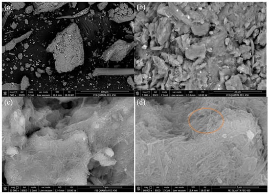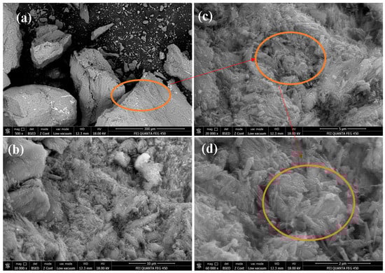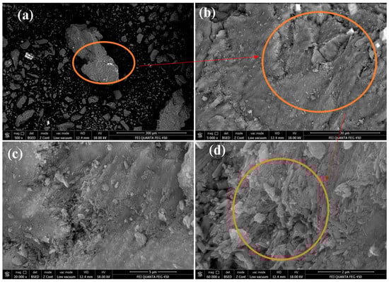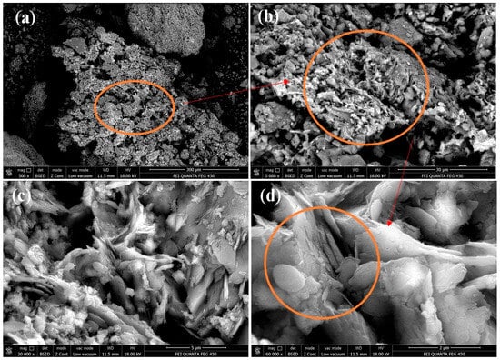The intermediate image (Figure 10b) shows well-defined sheet-like structures that are layered and partially broken, confirming muscovite as presented with red circle, which as a sheet silicate is formed by broad lamellae visible in SEM, where in the cracks of this material silicate from kaolin appears as fine-grained material filling the spaces between the plates, while at higher magnification (Figure 10c), the layered textures at this level of silicate are more prominent. The muscovite plates are more clearly visible, overlapping and forming an intercalated fabric. The very high magnification images (Figure 10d) show clear sheet-like structures confirming the presence of muscovite with its characteristic layered morphology. The smooth coatings between and on the muscovite sheets are consistent with kaolinite, while the sharp-edged fractures visible in the background reflect the dominant quartz structure.
