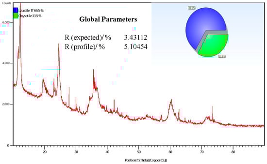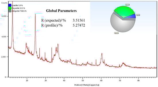 The mineralogical characteristics of sample 1 are presented below and illustrated in Figure 3. X-ray diffraction (XRD), interpreted using the Rietveld method, provided a detailed characterization of the sample’s mineralogical composition. The analysis identified three main minerals of the serpentine group: antigorite (54.4%), chrysotile (33.9%), and lizardite (11.6%). The diffraction pattern clearly shows the characteristic reflections of each phase: chrysotile exhibits sharp peaks at 12.0°, 24.2°, and 36.5° 2θ; antigorite is characterized by broader peaks at 11.4°, 19.3°, and 32.4° 2θ, typical of its disordered layer structure; while lizardite is identified by reflections at 19.7° and 55.2° 2θ, indicating its fine-grained nature. The quantitative analysis confirms antigorite as the dominant phase, followed by chrysotile and then lizardite.