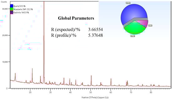 The mineralogical composition of sample 4 is illustrated in Figure 9. The XRD diffraction pattern using the Rietveld method shows a mineral assemblage dominated by 58.9% quartz, 32.2% muscovite-2M1 and 8.9% kaolin-1A. The diffraction pattern shows sharp and intense peaks, especially in the strong quartz reflections at 26.6° 2θ, indicating a high degree of crystallinity. Muscovite is identified by its characteristic reflections in the 10–80° 2θ scan, and a higher order reflection at 45° 2θ, while the main peak at 8.9° 2θ is not recorded because it falls outside the measured range, while kaolinite is recognized by its diagnostic peaks at 12.3° and 24.8° 2θ, indicating the presence of a secondary alteration phase.