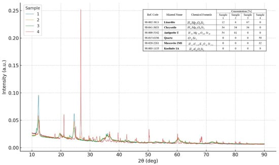 X-ray diffractometric (XRD) analysis of the four samples shown in this graph reveals considerable similarity in peak positions and shapes, but with considerable differences in intensity, reflecting the mineralogical differences between the samples. All diffractograms exhibit main diffraction peaks in the range 10–30° 2θ to 60° 2θ, which are characteristic of serpentine group minerals and other associated components, depending on the geological setting.