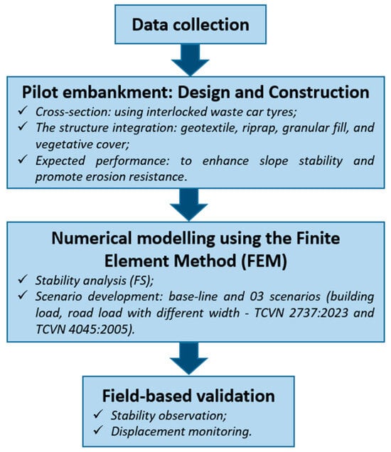 Overview of the research methodology, outlining the four key phases: data collection, pilot embankment design and construction, numerical modeling using the Finite Element Method, and field-based validation through displacement monitoring.