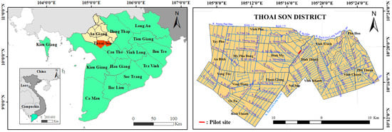 The pilot construction site in Dinh My commune (Thoai Son district, An Giang province) represents typical VMD challenges (Figure 2). The channel is 80 m wide and 8 m deep, with a discharge of 200 m3/s during the flood season. The riverbank section in the study area has experienced serious erosion in recent years. The study employs high-precision geodetic measurements and hydraulic sensors to establish a robust dataset for evaluating system performance and informing adaptive management strategies.