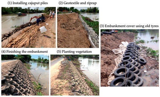The construction process of the embankment using waste tyres is presented in Figure 5, which included five steps. It started with piling using cajuput, which is a very popular foundation reinforcement method in the VMD. In the second step, geotextile was laid down before riprap was placed on top of the geotextile. In the third step, waste tyres were installed as the cover of the embankment using bolt connections. The fourth step involved earth fill work, and the final step was planting vegetation. After completion, the embankment was thoroughly inspected to ensure stability and safety, with periodic maintenance measures implemented to address any wear or damage.