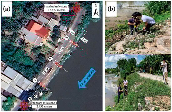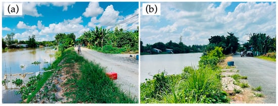 The Vietnamese Mekong Delta (VMD), a crucial agricultural and ecological hub in Southeast Asia, is increasingly threatened by riverbank erosion, a problem exacerbated by climate change and human activities [1]. With over half of its population living along riverbanks, the region experiences annual erosion rates of 10–20 m in critical zones, endangering livelihoods, infrastructure, and food security. These threats are projected to intensify due to changing monsoon patterns and rising sea levels [2,3,4,5]. In recent years, the VMD has witnessed alarming rates of riverbank and coastal erosion, resulting in serious economic and social consequences. Between 2010 and 2020, erosion damaged more than 500 km of riverbank and coastal lines, leading to an estimated economic loss of over 7000 billion VND (approximately 300 million USD) [6]. Over 30,000 households have been displaced due to erosion-related incidents [7]. In An Giang and Dong Thap provinces, entire communities were relocated after severe collapse events along the Mekong and Bassac Rivers (also called Tien and Hau rivers) [8]. In the long term, erosion not only disrupts rural livelihoods and resettlement plans but also threatens the region’s rice production and export capacity, upon which Vietnam’s food security and economy heavily rely [2].