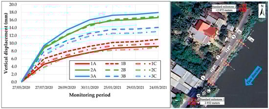 The vertical displacement monitoring results of the structure over time are presented in Figure 8. The embankment experienced its most significant vertical displacement during the first eight months of operation (from 27 May 2020 to 25 January 2021). The largest vertical displacement mark is 3A, with a deviation of 18 mm; the smallest vertical displacement marks are 1A and 2C, with a deviation of 9 mm. The vertical displacement marks are in the direction of the river but are within the allowable limits of QCVN 04–05:2022—Hydraulic structures—Essential regulations for design [57].