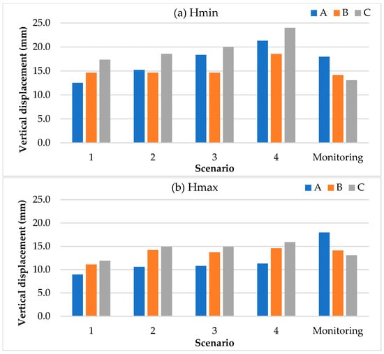 To better understand the embankment’s deformation behavior, the results in Figure 8 were grouped and analyzed according to the three cross-sections perpendicular to the shoreline: Section 1 (1A–1B–1C), Section 2 (2A–2B–2C), and Section 3 (3A–3B–3C). Each cross-section captures the horizontal variation in vertical displacement across the slope, from the top (point A) to the toe of the embankment (point C).