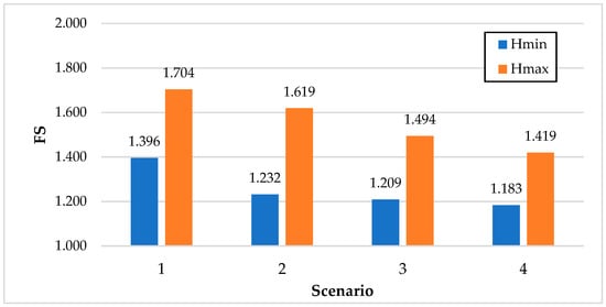 Figure 10 presents the Factor of Stability (FS) results derived from the FEM simulations for all scenarios. The analysis shows that even under the most critical case (Scenario 4), the minimum FS remains at 1.183, exceeding the regulatory threshold of FS ≥ 1.15 as required by QCVN 04–05:2022/BNNPTNT [57]. This confirms that the current embankment design with a slope ratio of m = 1.00 ensures sliding stability even under the most unfavorable combined loading conditions.