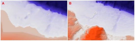 Comparison of bathymetries. (A)—Bathymetry derived from BACO, default configuration of the SMC-Brasil platform; (B)—harmonised bathymetry refined with detailed data. The insertion of detailed bathymetry is essential for the quality of the output product.