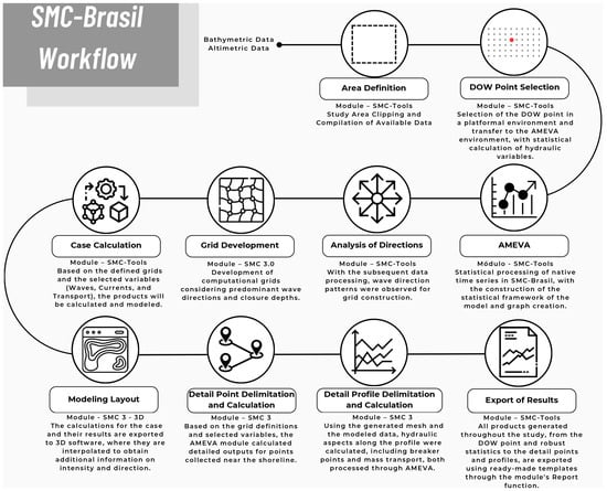 Semi-empirical systems such as SMC-Spain and SMC-Brasil emerged as adapted solutions for contexts with limited in situ data, using derivations of global climatological data, combining statistical representations and simplified physical modules aimed at regional analysis and support for coastal management [14,15]. The Coastal Modelling System (SMC), developed by the Hydraulic Institute of Cantabria—IH-Cantabria and adapted to the Brazilian context, is an alternative. The premise of SMC-Brasil is to assist coastal management, and the planning of actions related to the coast when generating data. It consists of a set of computer models that simulate coastal processes and provide valuable information for decision-making [8].