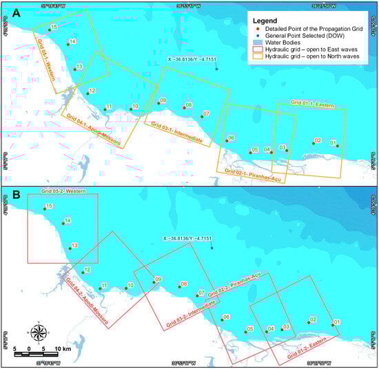Propagation grids and analysis execution points of SMC-Brasil. (A)—Grids configured for wave propagation from the northern spectrum; (B)—grids for wave propagation from the east. The same detail points were used for each grid, as well as the same DOW reference point.