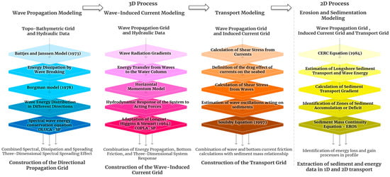 Current modelling is carried out by calculating the water gradients from wave simulations, coupled with hydrodynamic models, to generate the simulated products of wave–current interactions. In turn, sediment transport is calculated from longitudinal flows using the wave field and induced currents obtained, thus generating total transport, which is the sum of suspended transport and bottom transport using Soulsby’s formulations [37].