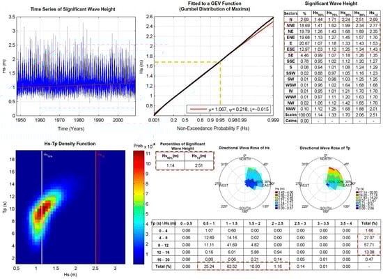 From a temporal point of view, the significant wave heights (Hs) varied between 0.57 m and 2.30 m in the period between 1948 and 2008, however, 78.62% of the records showed Hs of less than 1.4 m. The Hs50% value, representing the average sea state with a 50% probability of occurrence, was 1.14 m, while the Hs12%, associated with storm conditions with a probability of less than 1%, reached 2.51 m.