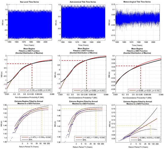 Collected patterns of tidal levels, astronomical tides, and meteorological tides, along with detailed statistical analyses. The red dashed lines indicate the position of the 95% non-exceedance probability value; the orange lines indicate the position of return periods of approximately 50 years.