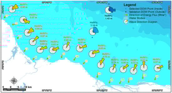 The average values of Hs50% of the points indicate medium sea conditions, with conditions not exceeding 1 m in any of the quadrants analysed. The closer to the west quadrant, the greater the average Hs amplitudes and, consequently, the greater the associated mechanical potential. Even the Hs50% patterns are in line with what has already been analysed in the region by other authors [21,60,61,62]. The hydrodynamic dispersion potential is in line with the internal and external DOW points, where there is a clear decrease in energy through dissipation, which is consequently associated with the material deposited on the coast [62,63].