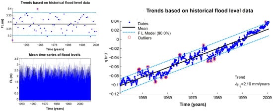 Historical series with calculated flood level. Trends based on historical flood level (FL) data. On the left, mean and annual time series of flood levels. On the right, trend of relative flood level elevation (η) from 1948 to 2008, with mean line (black), 90% confidence interval (blue dashed), and outliers (red circles). The estimated increase rate is 2.10 mm/year.