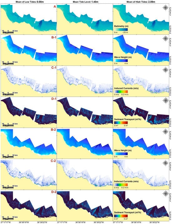 Simulations were performed on the grid under low, mid, and high tide conditions. (A)—Shows the bathymetric mesh used, which remained the same for all scenarios; the suffixes indicate grid openings, where 1 refers to grids open to northern wave directions and 2 to eastern directions; (B)—illustrates wave modelling under different astronomical conditions; (C)—represents wave-induced currents; and (D)—presents the different sediment transport scenarios. Distinct propagation patterns can be observed among the scenarios.
