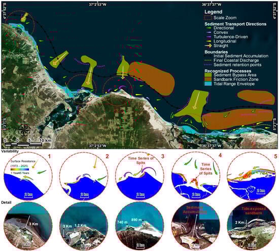 The consistency of the results is based on temporal data from orbital sensors, bibliographic data, and field observations, which ensures the reliability of what was surveyed, a set of accessible strategies to prove the findings with a high degree of reliability given that the area lacks a continuous monitoring network. Therefore, analysing the results from an analytical perspective, the main conceptual contribution of this work was the identification of the role of submerged irregularities in modulating wave propagation and inducing currents, influencing deposition and erosion along the coast. The conceptual contributions found were consistent with reference publications [56,57,58,59,60,61,62] in terms of wave direction, but differed in terms of flow intensity, suggesting local morphological control not captured in previous studies.