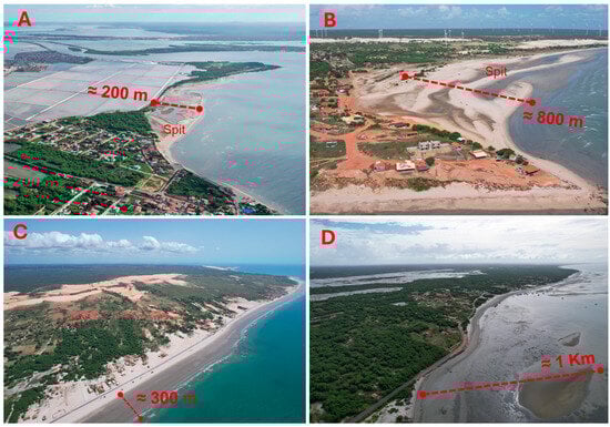 - Silva, F.E.; Vital, H. Quantifying the High Coastal Dynamics of Tropical Mesotidal Barrier Island-Spit Systems: Case Study in Northeast Brazil. Geo-Mar. Lett. 2019, 40, 897–909. [Google Scholar] [CrossRef]