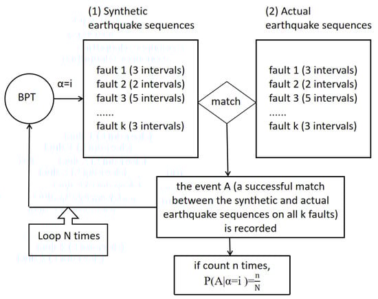 Figure 1, the method employed in this study is summarized as follows. The simulation is repeated N times, during which the event A (a successful match between the synthetic and actual earthquake sequences on all k faults) is recorded each time it occurs. The probability of event A for given values of α is denoted as: