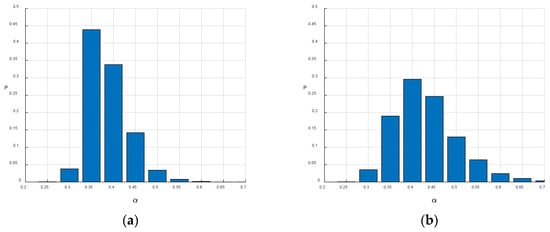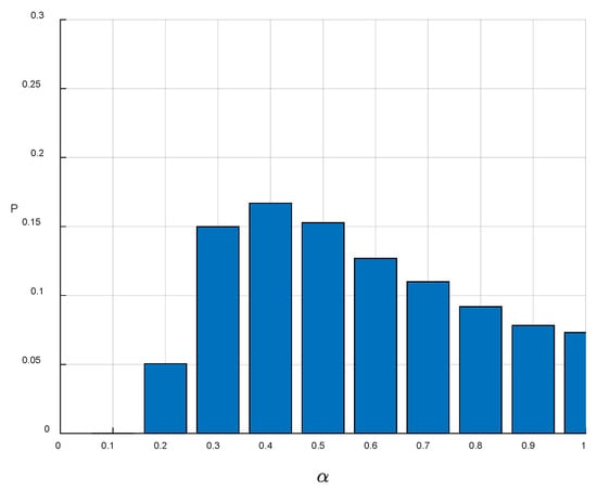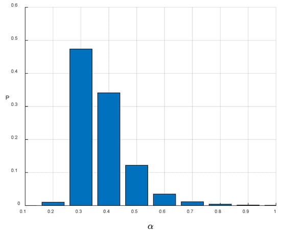 By repeating the simulation N times (where N = 1,000,000 in this study) and counting the number of matches between the synthetic and observed earthquake sequences across all k faults, the probability of matching for a given value of α can be estimated. Consequently, through simulations conducted for different values of α within its feasible range (0 to 1.0), the probability distribution of α values can be derived.