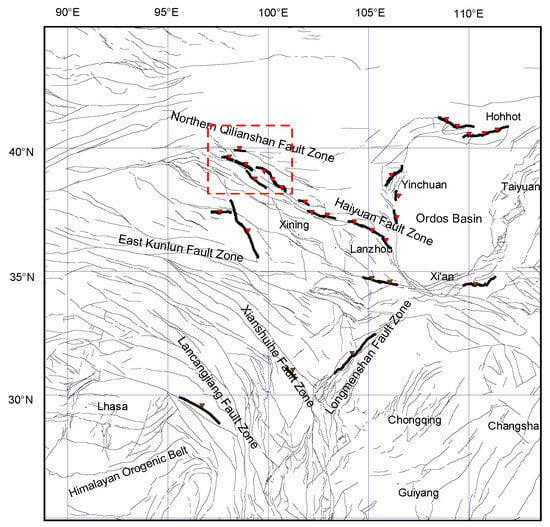 | 29 | Yumen–Beidahe Fault | Left-lateral strike–slip fault | 3 | E1: 9415 ± 1115 E2: 4590 ± 790 E3: 1785 ± 145 E4: <1630 ± 170 | 2 | [23,24] |