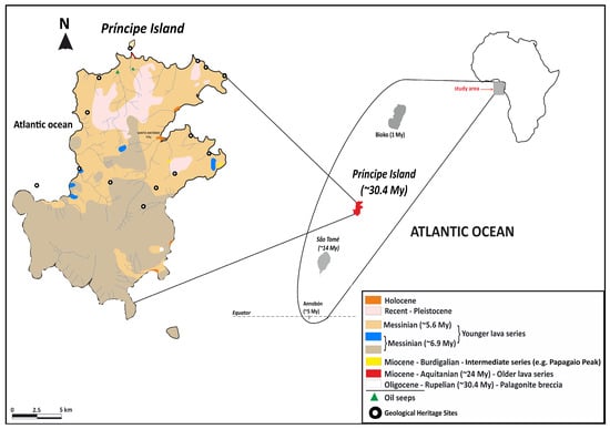 The islands of Sao Tome and Principe constitute a volcanic archipelago, comprising two principal islands and several smaller islets located in the Gulf of Guinea (West Africa), along the Cameroon Volcanic Line (CVL). The island of Príncipe is the smallest in the archipelago, with a total area of 136 km2 and situated close to the equator line at 1°36′ N–7°23′ E (Figure 1).