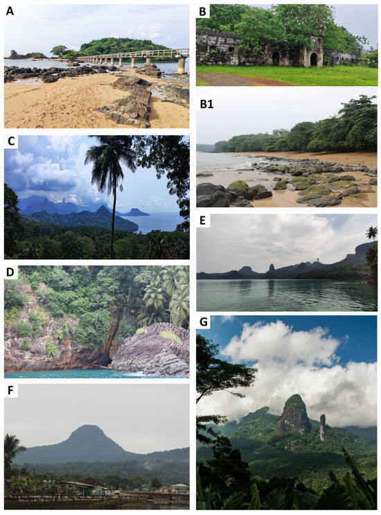 Geological heritage sites of Príncipe Island: (A) Bom Bom Islet; (B) Sundy Plantation and (B1) Sundy Beach; (C) Oquê Daniel (Salaszoy) Viewpoint; (D) Praínha; (E) Agulhas Bay; (F) Papagaio peak; (G) São Joaquim Viewpoint.