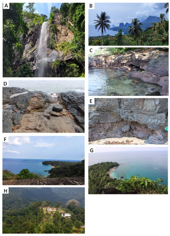 Geological heritage sites of Príncipe Island: (A) Oquê Pipi Waterfall; (B) Nova Estrela Viewpoint; (C) Salgada Beach; (D) Évora Beach; (E) Boi Beach; (F) Antena Viewpoint; (G) Banana Beach Viewpoint, (H) Roça Terreiro Velho.