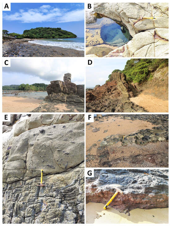 Main geological features of Bom Bom Islet: (A) Bom Bom Islet; (B) giant pots; (C) trachytic vein; (D) phyllonian rocks; (E) xenoliths in the phylon; (F) conglomeratic deposits; (G) contact between breccia and older lava series.