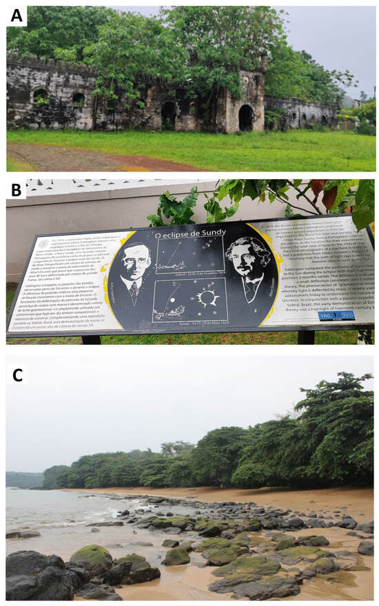 The Sundy Plantation and Sundy Beach correspond to an historic farmstead where, in May 1919, Sir Arthur Eddington made an expedition to observe a solar eclipse that first experimentally tested and verified Albert Einstein’s theory of relativity [9,37] (Figure 7). In this sense, it corresponds to the concept of symbolic content described by [15]. In 2023, the site was recognized as part of the country’s indicative list of World Heritage candidate sites. The outcrops show rocks of the older series rocks that are blended with phonolitic rocks, producing a lava tongue that reaches northward to the basaltic plateau, which consists of lava from the younger series [28].