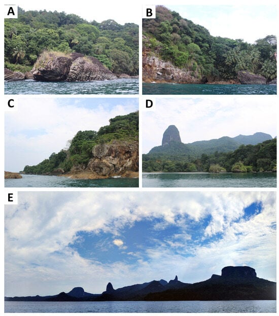 - Schlüter, T.; Trauth, M.H. São Tomé et Príncipe. In Geological Atlas of Africa. Geological Atlas of Africa: With Notes on Stratigraphy, Tectonics, Economic Geology, Geohazards and Geosites of Each Country; Springer: Berlin/Heidelberg, Germany, 2006; pp. 192–193. [Google Scholar]