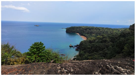 As a node (18: Príncipe “Einstein’s Theory of Relativity”) of the “African Pole of Rotation” Corridor, revealing the geoheritage of this island could enhance the Corridor’s ability to establish a sustainable tourism route, thus fostering growth across all sectors of tourism, education, and entrepreneurship, as well as benefiting the broader community [9]. Furthermore, the promotion of geotourism as a strategic economic activity on the island can lead to the expansion and diversification of the current tourism offer, as the marketing of the island is based, above all, on the country’s extraordinary biodiversity [11,12].