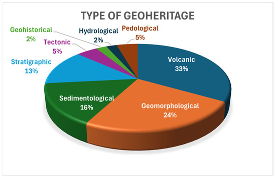The geological heritage sites on the island are predominantly of the volcanic type, a consequence of the island’s volcanic origin. However, other categories of geological heritage are also identifiable, including those of stratigraphic, paleontological, sedimentological, geomorphological, hydrological, geohistorical, and tectonic nature [39] (see Figure 13).