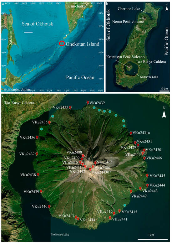 Geographical location of the study area. The base map is from the ESRI World Imagery map. (a) Onekotan Island in the Kuril Islands; (b) Onekotan Island; and (c) Krenitsyn Peak volcano, with sampling sites marked by red icons. Blue circles indicate the locations of gravitational processes, the results of which completely overlap with lava and/or pyroclastic flows.