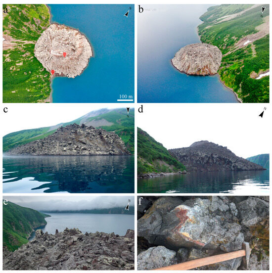 Extrusive dome of the 1952 eruption. (a,b) View from above (photo by I.E. Bolshakov) obtained using a DJI Mavic 2 Enterprise quadcopter. Red symbols indicate sampling locations. (c,d) View from the surface of Lake Koltsevoye. (d) Near-summit part of the dome of 1952. (e,f) Fumarolic mineralization.