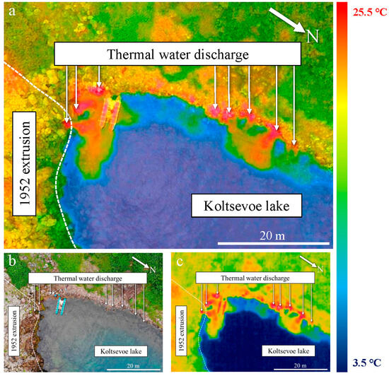 Today, at the northern contact between the extrusive dome and the main edifice of the volcano, several small discharges of thermal waters are observed (Figure 5). The images in Figure 5 were obtained using a DJI Mavic 2 Enterprise drone equipped with a thermal imaging camera. Thermal waters discharge into the lake both from the extrusion itself and from the base of the main volcanic edifice (Figure 5). The capacity of these discharges is relatively low, as the thermal waters form only a thin layer (approximately 5–10 cm) on the surface of the cold lake water. The plumes of heated water extend only 10–20 m from the discharge points before cooling down to the background lake water temperature. The maximum temperature of the thermal waters, measured with a thermocouple, was 25.5 °C, while the background temperature of Lake Koltsevoye was 3.5 °C. No other thermal anomalies were detected on the Krenitsyn Peak volcano.