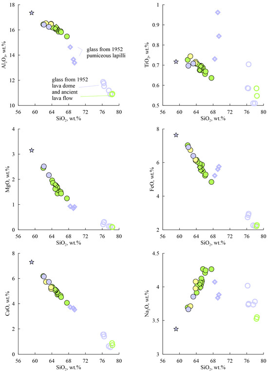 The groundmass of the rocks consists of microlites of plagioclase, pyroxene (augite, pigeonite, and orthopyroxene), cristobalite (for dacites), apatite, and titanomagnetite embedded in rhyolitic glass. The glass composition varies from sample to sample—76–78.5 wt.% SiO2, 2.5–2.7 wt.% K2O in dacites and andesitic dacites, and 68.5–69.5 wt.% SiO2 and 1.8–1.9 wt.% K2O in the more mafic (andesite) pumiceous lapilli. The pressure at the last equilibrium of the melt with microlites, approximately estimated from the glass composition [29,30], corresponds to 0.2–0.3 kbar for lava flow rocks and extrusive domes and 0.5 kbar for pumiceous lapilli from the 1952 eruption.