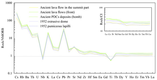 The distribution of rare earth elements (Table 2) and trace elements in the rocks of the volcano is typical for island arc volcanoes, with significant enrichment of K, Pb, and Sr and depletion of (Ta)-Nb and Ti relative to N-MORB compositions (Figure 8). The europium anomaly is expressed unevenly in different rocks: slightly positive in the lava flow from the summit part of the volcano’s building, slightly negative in the ancient lava flows and the rocks of the extrusive dome from 1952, and completely absent in the compositions of lapilli from 1952 and bombs from ancient PDC deposits.