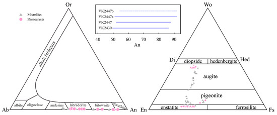 Phenocrysts of pyroxenes consist of prismatic crystals up to 0.5 mm long and, less frequently, up to 1 mm long. Rare (Figure 9c) and relatively large clinopyroxene crystals (0.5–1 mm) are characterized by the presence of cores showing signs of resorption (numerous melt and mineral inclusions). The phenocrysts of clinopyroxene (Figure 10) are represented by augite (Mg# 70–75), and orthopyroxene is represented by minerals of the enstatite–ferrosilite series (Mg# 57–71). In some samples, phenocrysts of pyroxenes typically demonstrate simple reverse zoning with jumps in Mg# (Mg# = Mg/(Mg + Fe)) of 2–4 mol. %, while in other samples, the pyroxenes are predominantly homogeneous in composition, but the formation of pigeonite rim around individual clinopyroxene phenocrysts is observed (Figure 9d). All pyroxenes from all samples are characterized by a submicron iron-rich rim forming at the contact with the groundmass.