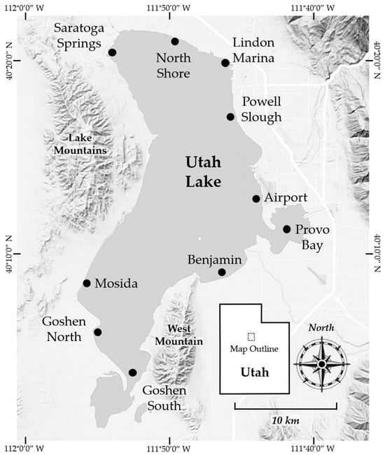 We chose core collection sites in Utah Lake based on three factors: (1) the number of cores, (2) our equipment’s ability to reach the lakebed, and (3) the suitability of the sediment for sampling. As mentioned, Last and Smol [] recommend collecting 5–10 sediment cores to adequately represent an entire lake. Due to Utah Lake’s large size, we chose to collect 10 sediment core samples from within the lake.
