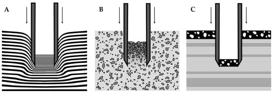 The use of open-barrel core samplers often produces sediment cores that are shorter than the penetrated depth. This phenomenon, known as core shortening, can be caused by multiple processes, including sediment thinning, physical compaction, and sediment bypassing [,,]. Sediment thinning (Figure 2A) is the most common form of core shortening. It occurs when a penetrating object stretches and compresses the sediment as the sampling cylinder is forced downward. In sediment thinning, all the sediment layers are still present, but both the mass and volume of the sediment are reduced, as manifested by thinner sediment layers within the core sample [,,]. A second form of core shortening is physical compaction (Figure 2B) which occurs when water or air is forcibly expelled from a sediment layer, causing the sediment to become more densely packed, reducing the sediment’s volume while maintaining its mass []. A third form of core shortening is sediment bypassing (Figure 2C). It occurs when a core sampler becomes clogged and excludes sediment layers during the sampling process. Sediment bypassing typically occurs when sampling firm sediment layers overlying softer sediment [].